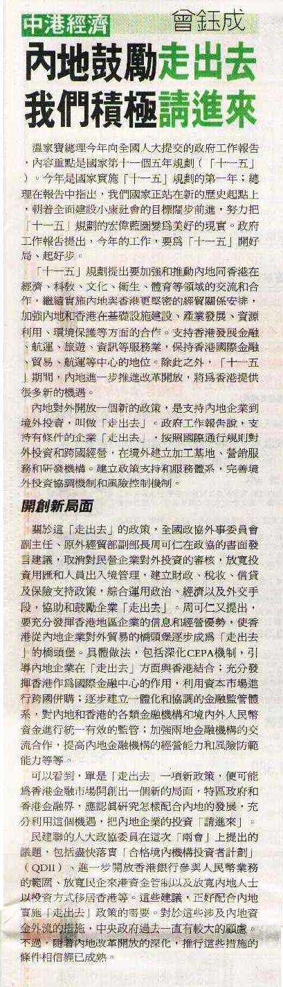 民建聯的人大政協委員在這次「兩會」上提出的議題,包括盡快落實「合格境內機構投資者計劃」(QDII)、進一步開放香港銀行參與人民幣業務的範圍、放寬民企來港資金管制以及放寬內地人士以投資方式移居香港等。這些建議,正好配合內地實施「走出去」政策的需要。對於這些涉及內地資金外流的措施,中央政府過去一直有較大的顧慮。不過,隨着內地改革開放的深化,推行這些措施的條件相信經已成熟。