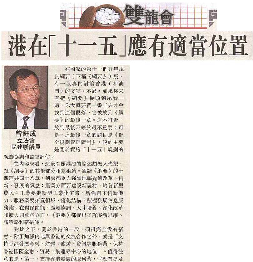 在國家的第十一個五年規劃綱要(下稱《綱要》)裏,有一段專門討論香港(和澳門)的文字。不過,如果你未有把《綱要》從頭到尾看一遍,你大概要費一番工夫才會找到這個段落。它被放到《綱要》的最後一章。這不打緊:放到最後不等於最不重要;可是,這最後一章的題目是《健全規劃管理體制》,說的主要是關於實施「十一五」規劃的統籌協調和監督評估。