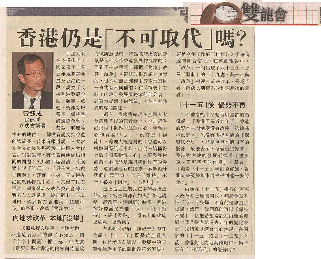 上星期我在本欄指出,國家第十一個五年規劃綱要提及香港的一段,說要「支持香港發展金融、航運、旅遊、資訊等服務業,保持香港國際金融、貿易、航運等中心的地位」,卻沒有說支持香港的物流業。後來有報道說,人大常委會委員長吳邦國參加港區人大代表小組討論時,有代表向他提出相同的問題;吳邦國即席澄清,《綱要》說「航運」,「只是文字出現了問題」,其實「中央一直支持香港發展為物流中心」。其後有代表證實,國家發展及改革委員會聽取港區人大意見後,決定把十一五規劃內,談及保持香港為「航運中心」的字眼,改為「物流中心」。