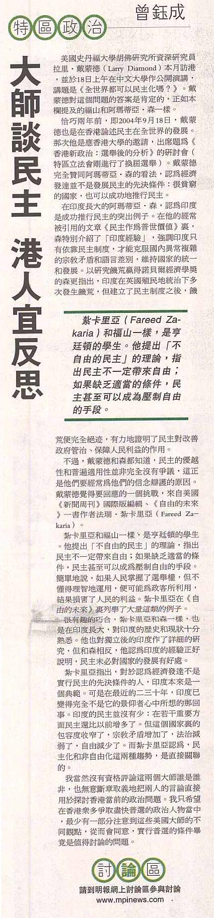 恰巧兩年前,即2004年9月18日,戴蒙德也是在香港論述民主在全世界的發展。那次他是應香港大學的邀請,出席題為《香港新政治:選舉後的分析》的研討會(特區立法會剛進行了換屆選舉)。戴蒙德完全贊同阿瑪蒂亞‧森的看法,認為經濟發達並不是發展民主的先決條件:很貧窮的國家,也可以成功地推行民主。