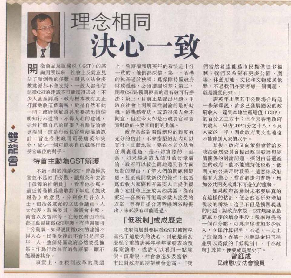 事實上,在稅制改革的問題上,曾蔭權和唐英年的看法是十分一致的。他們都深信,第一,香港的稅基過於狹窄;為保障特區政府財政穩健,必須擴闊稅基;第二,開徵GST是擴闊稅基的最有效可行辦法;第三,目前正是提出問題、爭取在社會上開展理性討論的最好時機。這幾點看法,或許很多人會不同意,但在今天卻是行政長官和負責財政的主要官員們的共識。