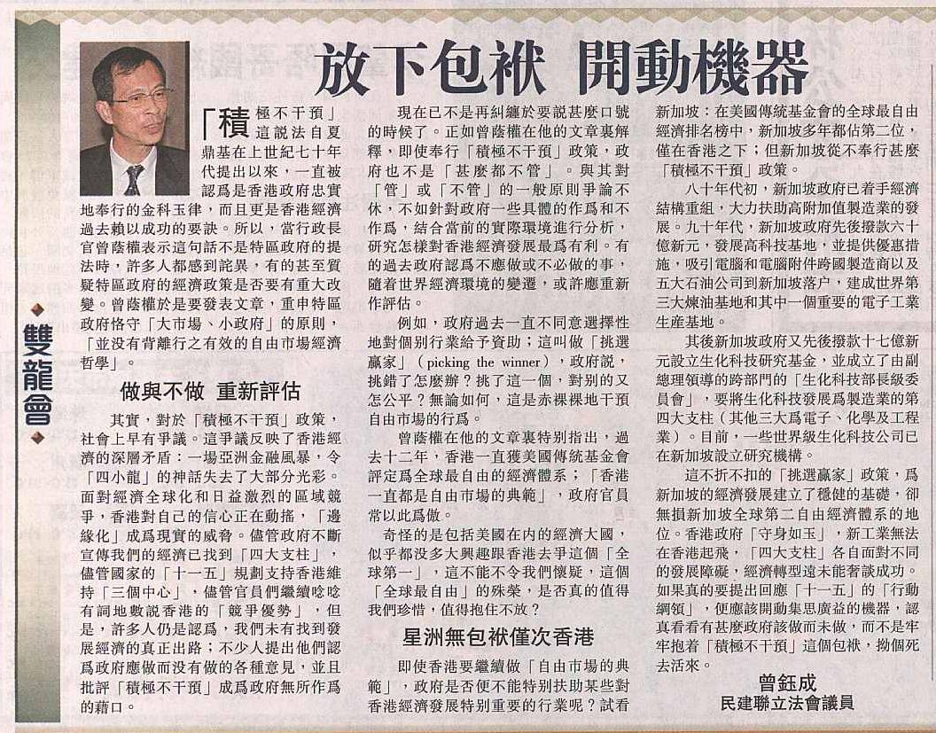 這不折不扣的「挑選贏家」政策,為新加坡的經濟發展建立了穩健的基礎,卻無損新加坡全球第二自由經濟體系的地位。香港政府「守身如玉」,新工業無法在香港起飛,「四大支柱」各自面對不同的發展障礙,經濟轉型遠未能奢談成功。如果真的要提出回應「十一五」的「行動綱領」,便應該開動集思廣益的機器,認真看看有甚麼政府該做而未做,而不是牢牢抱着「積極不干預」這個包袱,拗個死去活來。