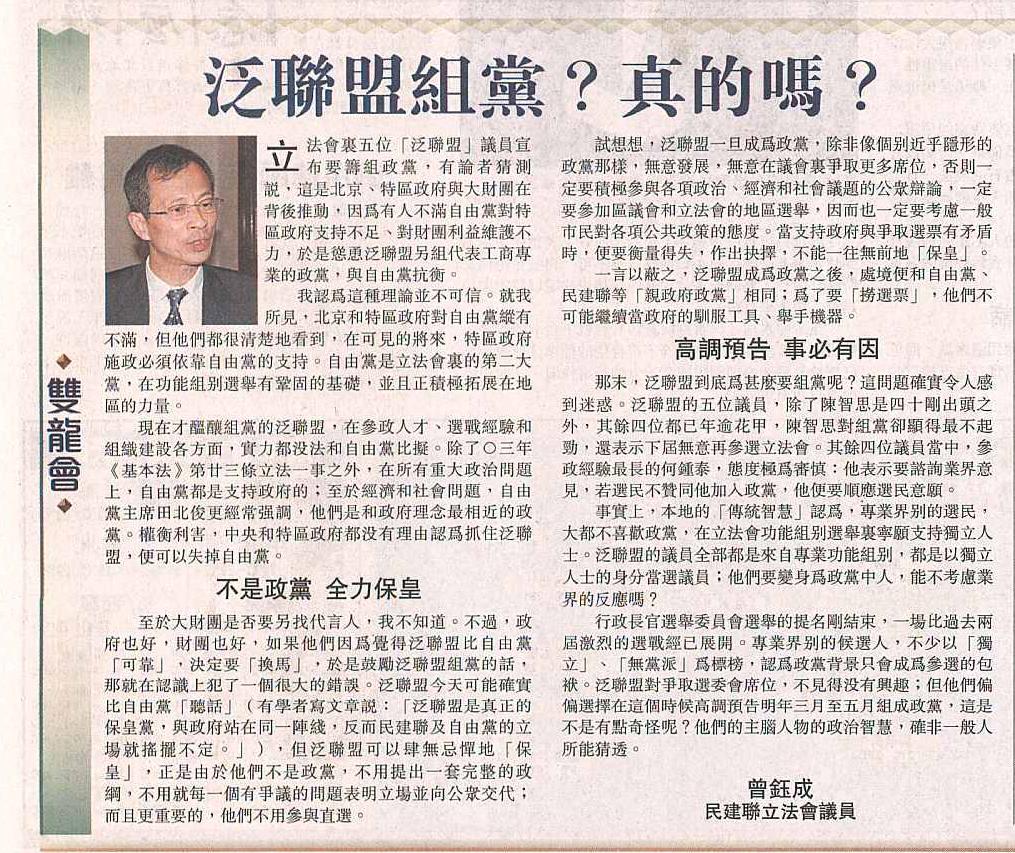 至於大財團是否要另找代言人,我不知道。不過,政府也好,財團也好,如果他們因為覺得泛聯盟比自由黨「可靠」,決定要「換馬」,於是鼓勵泛聯盟組黨的話,那就在認識上犯了一個很大的錯誤。泛聯盟今天可能確實比自由黨「聽話」(有學者寫文章說:「泛聯盟是真正的保皇黨,與政府站在同一陣綫,反而民建聯及自由黨的立場就搖擺不定。」),但泛聯盟可以肆無忌憚地「保皇」,正是由於他們不是政黨,不用提出一套完整的政綱,不用就每一個有爭議的問題表明立場並向公眾交代;而且更重要的,他們不用參與直選。