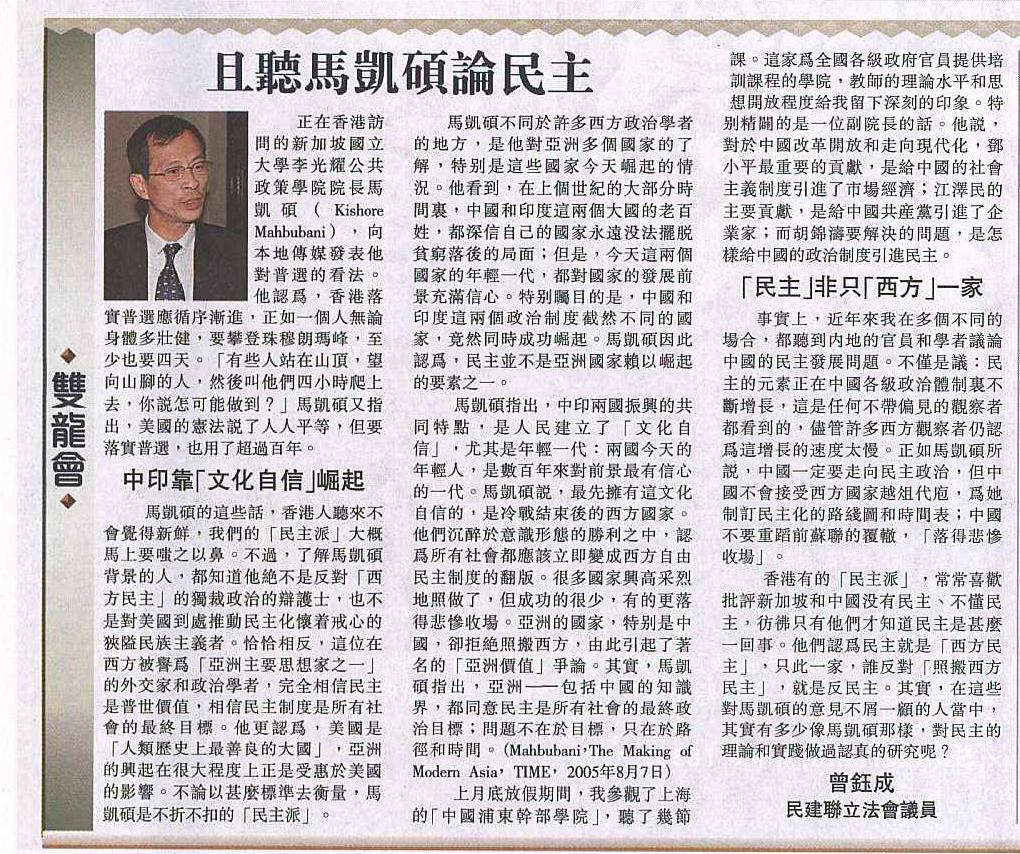 馬凱碩的這些話,香港人聽來不會覺得新鮮,我們的「民主派」大概馬上要嗤之以鼻。不過,了解馬凱碩背景的人,都知道他絕不是反對「西方民主」的獨裁政治的辯護士,也不是對美國到處推動民主化懷�荍暀萿滲U隘民族主義者。恰恰相反,這位在西方被譽為「亞洲主要思想家之一」的外交家和政治學者,完全相信民主是普世價值,相信民主制度是所有社會的最終目標。他更認為,美國是「人類歷史上最善良的大國」,亞洲的興起在很大程度上正是受惠於美國的影響。不論以甚麼標準去衡量,馬凱碩是不折不扣的「民主派」。馬凱碩不同於許多西方政治學者的地方,是他對亞洲多個國家的了解,特別是這些國家今天崛起的情況。他看到,在上個世紀的大部分時間�堙A中國和印度這兩個大國的老百姓,都深信自己的國家永遠沒法擺脫貧窮落後的局面;但是,今天這兩個國家的年輕一代,都對國家的發展前景充滿信心。特別矚目的是,中國和印度這兩個政治制度截然不同的國家,竟然同時成功崛起。馬凱碩因此認為,民主並不是亞洲國家賴以崛起的要素之一。