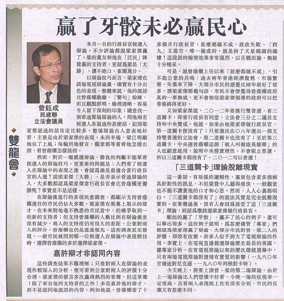 然而,對於一場競選辯論,勝負的判斷不能單看候選人的辯論技巧。更重要的問題是:人們看了候選人在辯論中的表現之後,會認為誰是最適合當行政長官的人選?說梁家傑「大勝」,是否表示看過辯論的人,大多數都認為梁家傑當行政長官會比曾蔭權更優勝呢?事實並不是這樣。