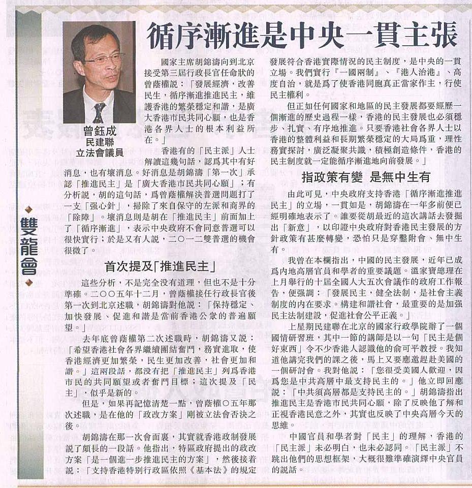 上星期民建聯在北京的國家行政學院辦了一個國情研習班,其中一節的講師是以一句「民主是個好東西」令不少香港人認識他的俞可平教授。我知道他講完我們的課之後,馬上又要應邀趕赴美國的一個研討會。我對他說:「您很受美國人歡迎,因為您是中共高層中最支持民主的。」他立即回應說:「中共須高層都是支持民主的。」胡錦濤指出推進民主是香港市民共同心願,除了反映他了解和正視香港民意之外,其實也反映了中央高層今天的思維。