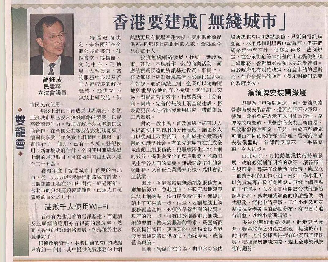 無綫上網已日漸成為世界潮流,多個亞洲城市早已投入無綫網絡的競賽,以提高營商競爭力。新加坡政府與互聯網供應商合作,在全國公共場所架設無綫寬頻,讓國民享受三年免費上網服務。據報,計畫推行了一個月,已有十八萬人登記使用;新加坡政府估計,全國使用無綫熱點上網的用戶數目,可在兩年內由五萬人增至二十五萬。獲頒年度「智慧城市」首獎的台北市,從一九九九年起推行網路城市計畫,具體建設工程在○四年開始。經過兩年,台北市的無綫寬頻覆蓋範圍,已達人口覆蓋率的百分之九十。