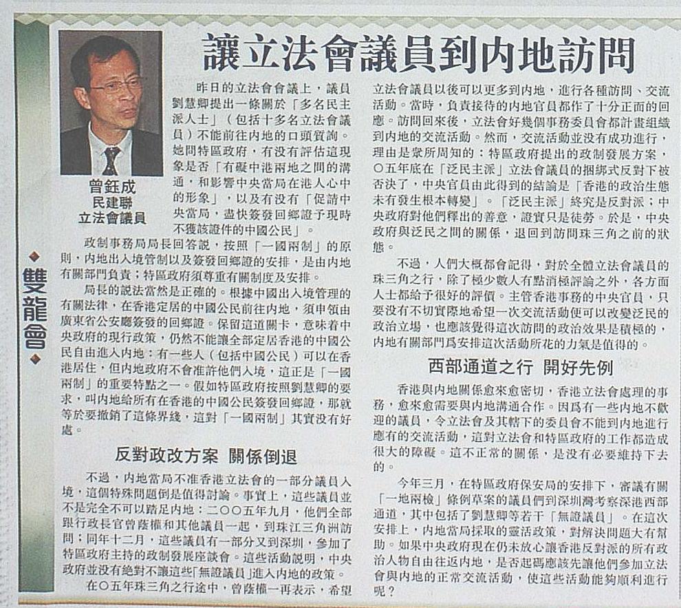今年三月,在特區政府保安局的安排下,審議有關「一地兩檢」的條例草案的議員們到深圳灣考察深港西部通道,其中包括了劉慧卿等若干「無證議員」。在這次安排上,內地當局採取的靈活政策,對解決問題大有幫助。如果中央政府現在仍未放心讓香港反對派的所有政治人物自由往返內地,是否起碼應該先讓他們參加立法會與內地的正常交流活動,使這些活動能夠順利進行呢?(完)
