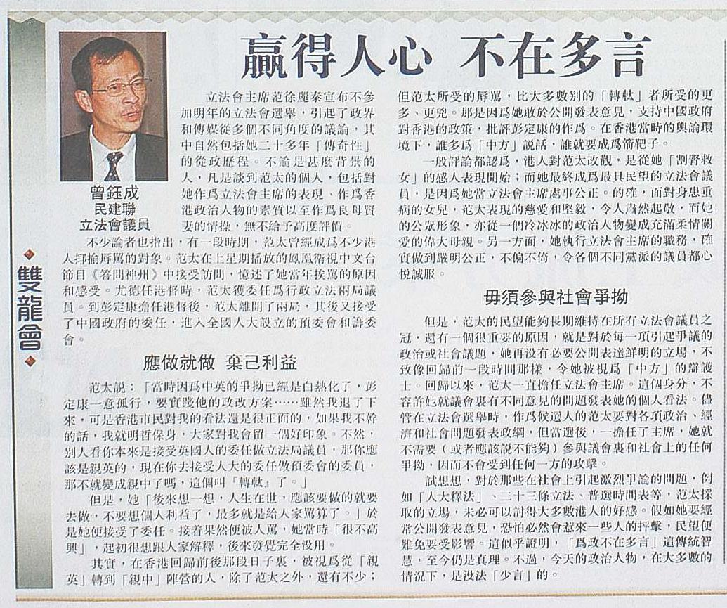 立法會主席范徐麗泰宣布不參加明年的立法會選舉,引起了政界和傳媒從多個不同角度的議論,其中自然包括她二十多年「傳奇性」的從政歷程。不論是甚麼背景的人,凡是談到范太的個人,包括對她作為立法會主席的表現、作為香港政治人物的素質以至作為良母賢妻的情操,無不給予高度評價。