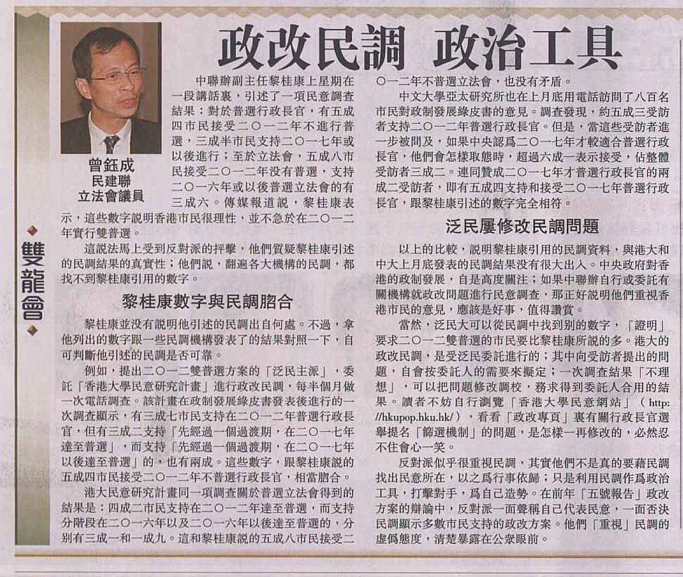 以上的比較,說明黎桂康引用的民調資料,與港大和中大上月底發表的民調結果沒有很大出入。中央政府對香港的政制發展,自是高度關注;如果中聯辦自行或委託有關機構就政改問題進行民意調查,那正好說明他們重視香港市民的意見,應該是好事,值得讚賞。當然,泛民大可以從民調中找到別的數字,「證明」要求二○一二雙普選的市民要比黎桂康所說的多。港大的政改民調,是受泛民委託進行的;其中向受訪者提出的問題,自會按委託人的需要來擬定;一次調查結果「不理想」,可以把問題修改調校,務求得到委託人合用的結果。讀者不妨自行瀏覽「香港大學民意網站」(http://hkupop.hku.hk/),看看「政改專頁」裏有關行政長官選舉提名「篩選機制」的問題,是怎樣一再修改的,必然忍不住會心一笑。
