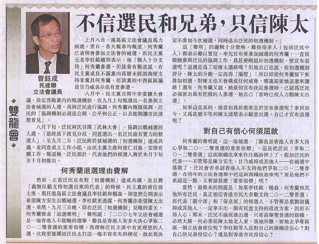 當然,最根本的問題是:如果李柱銘、楊森、何秀蘭和其他所有泛民,真正相信香港市民大多數支持二○一二雙普選;而代表「親中派」和「保皇派」的候選人,不管那是葉劉淑儀抑或其他人,一定拿不出一個有民意支持的政改方案,因而不得人心;那末,泛民不論派誰出選,只要高舉雙普選的旗幟,必然大勝,何必委屈陳太她老人家,強她所難,要她去爭奪區區一個立法會席位呢?李柱銘等人是對自己的旗幟沒信心?對自己的兄弟沒信心?還是對香港市民沒信心?(完)