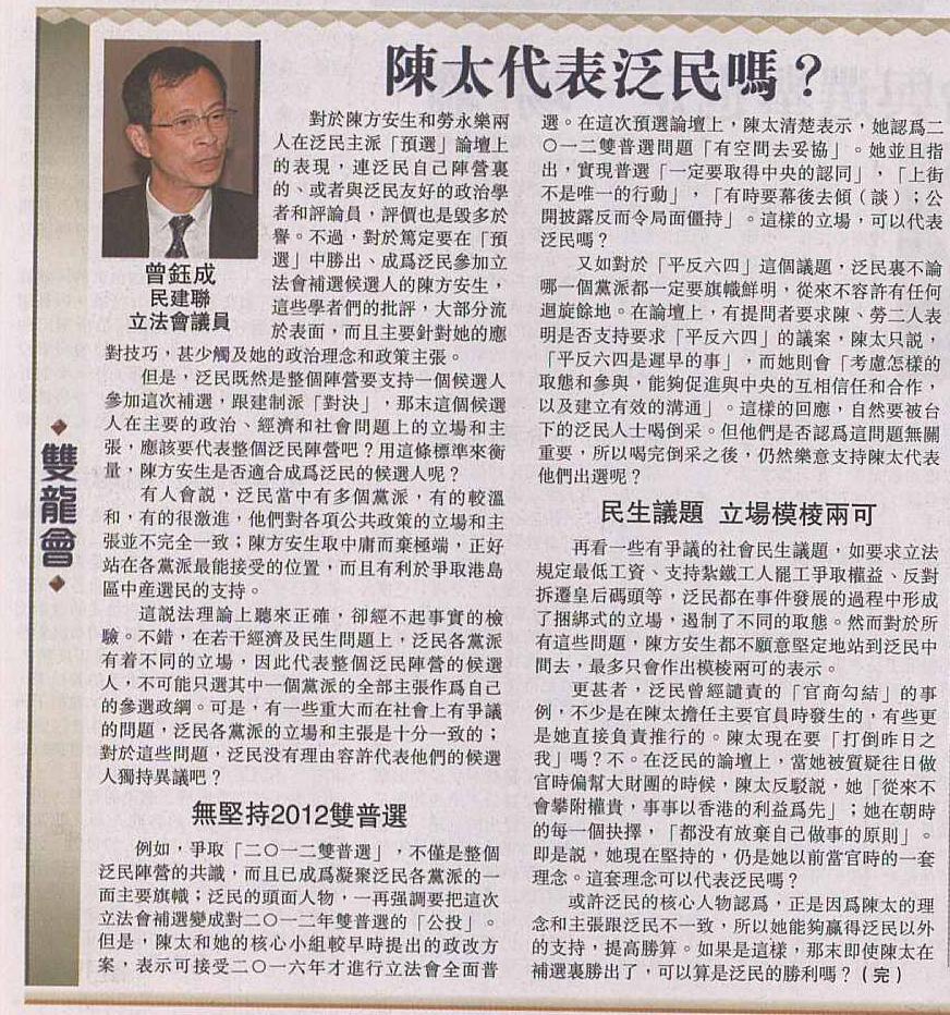 例如,爭取「二○一二雙普選」,不僅是整個泛民陣營的共識,而且已成為凝聚泛民各黨派的一面主要旗幟;泛民的頭面人物,一再強調要把這次立法會補選變成對二○一二雙普選的「公投」。但是,陳太和她的核心小組較早時提出的政改方案,表示可接受二○一六年才進行立法會全面普選。在這次預選論壇上,陳太清楚表示,她認為二○一二雙普選問題「有空間去妥協」。她並且指出,實現普選「一定要取得中央的認同」,「上街不是唯一的行動」,「有時要幕後去傾﹝談﹞;公開披露反而令局面僵持」。這樣的立場,可以代表泛民嗎?