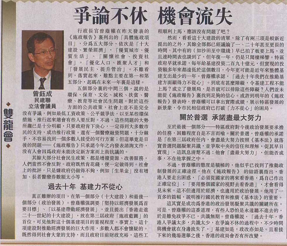 然而,看看這十大建設的清單,除了有兩三項是較新近提出的之外,其餘全部都已經議論了一、二十年甚至更長的時間,其中有的(如沙田至中環)早已拍了板要上馬,並且連時間表也談到了,但年復一年,仍是只聞樓梯響。特區政府早就承諾,每年給基建投資二百九十億元,但實現的投資額多年來都遠低於這個數目,今年更可能是近年來整體基建支出最少的一年。曾蔭權承認,「過去十年我們在推動基建方面顯得力不從心」。到底有甚麼障礙,令基建工程不能上馬?成立了發展局,是否就可以排除這些障礙?人們並未能從《施政報告》裏找到足夠的信心。或許到明年的《施政報告》發表時,曾蔭權可以拿出實際成績,展示特區發展的新景象,令市民相信政府已打破「力不從心」的困局。