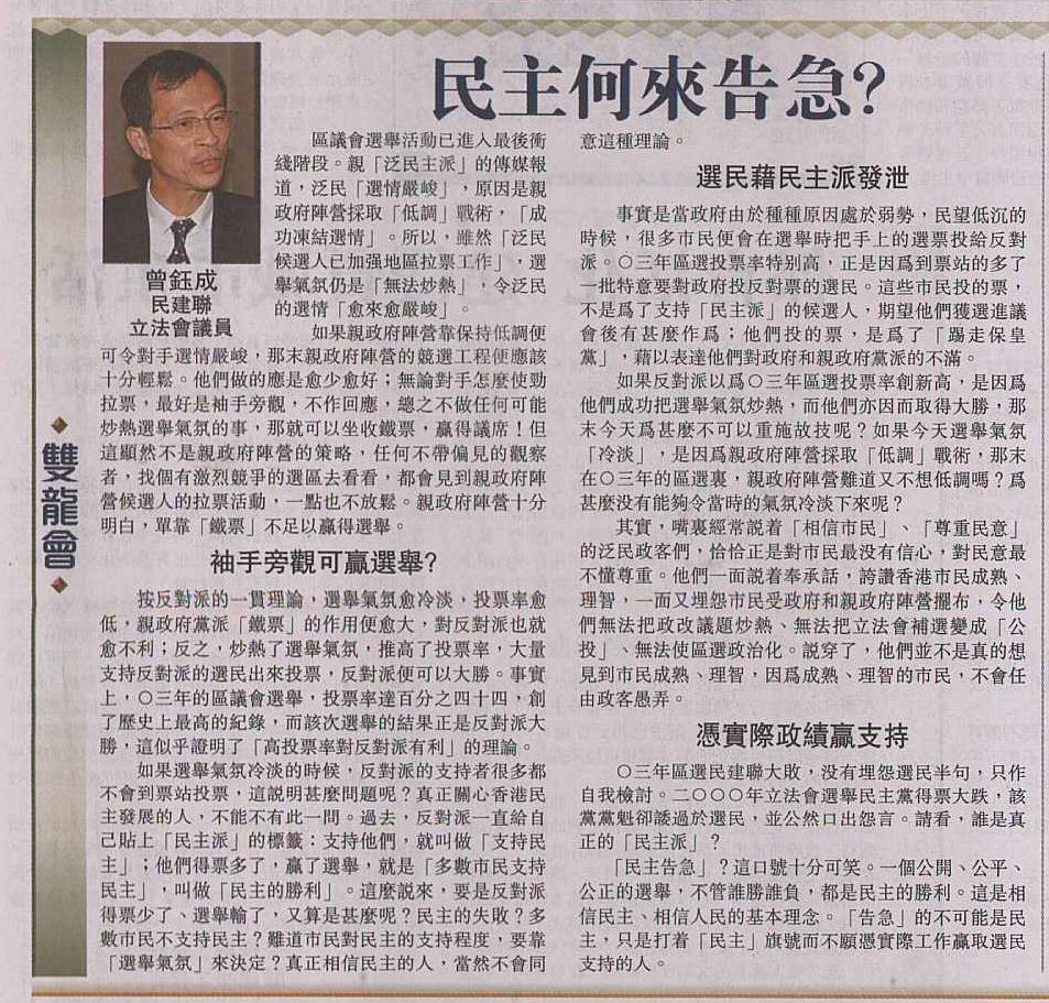 ○三年區選民建聯大敗,沒有埋怨選民半句,只作自我檢討。二○○○年立法會選舉民主黨得票大跌,該黨黨魁卻諉過於選民,並公然口出怨言。請看,誰是真正的「民主派」?