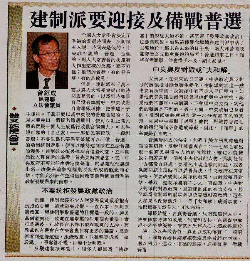 但是,建制派卻千萬不要以為人大常委會提出的時間表是假的,以為到時如果自己沒有準備好,中央政府自會羅織理據,把普選日子往後推。千萬不要以為中央說的普選是假的,以為只要弄出一個提名篩選機制,便可以阻止高民望的泛民主派人士成為行政長官候選人,可以保證可靠的「自己友」──那怕民望較低──順利當選;不要以為只要保留某種可以叫做「普選」的功能組別選舉,便可以維持建制派在立法會裏的優勢。建制派必須丟掉所有這些幻想,立即開始投入真普選的準備。首先要解放思想,從「中央政府不可能任由香港搞普選」的思維框框裏走出來;改變在這個框框裏長期形成的觀念和心態,才能充分評估並積極回應普選時間表對香港政制發展帶來的衝擊。