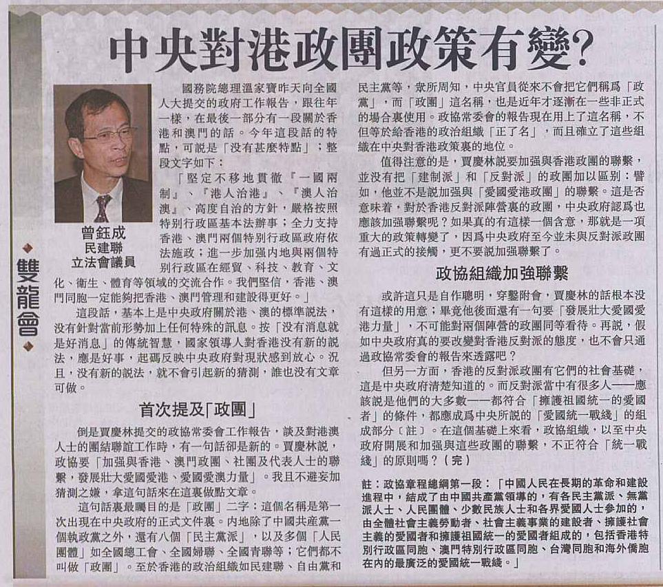 值得注意的是,賈慶林說要加強與香港政團的聯繫,並沒有把「建制派」和「反對派」的政團加以區別:譬如,他並不是說加強與「愛國愛港政團」的聯繫。這是否意味着,對於香港反對派陣營裏的政團,中央政府認為也應該加強聯繫呢?如果真的有這樣一個含意,那就是一項重大的政策轉變了,因為中央政府至今並未與反對派政團有過正式的接觸,更不要說加強聯繫了。