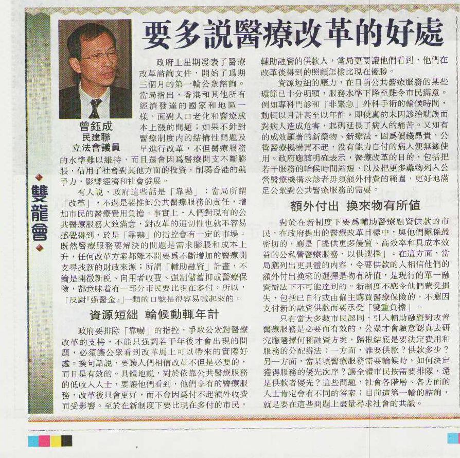 只有當大多數市民認同,引入輔助融資對改善醫療服務是必要而有效的,公眾才會願意認真去研究應選擇何種融資方案,歸根結底是要決定費用和服務的分配辦法:一方面,誰要供款?供款多少?另一方面,當某項醫療服務需要輪候時,如何決定獲得服務的優先次序?讓全體市民按需要排隊,還是供款者優先?這些問題,社會各階層、各方面的人士肯定會有不同的答案;目前這第一輪的諮詢,就是要在這些問題上盡量尋求社會的共識。(完)