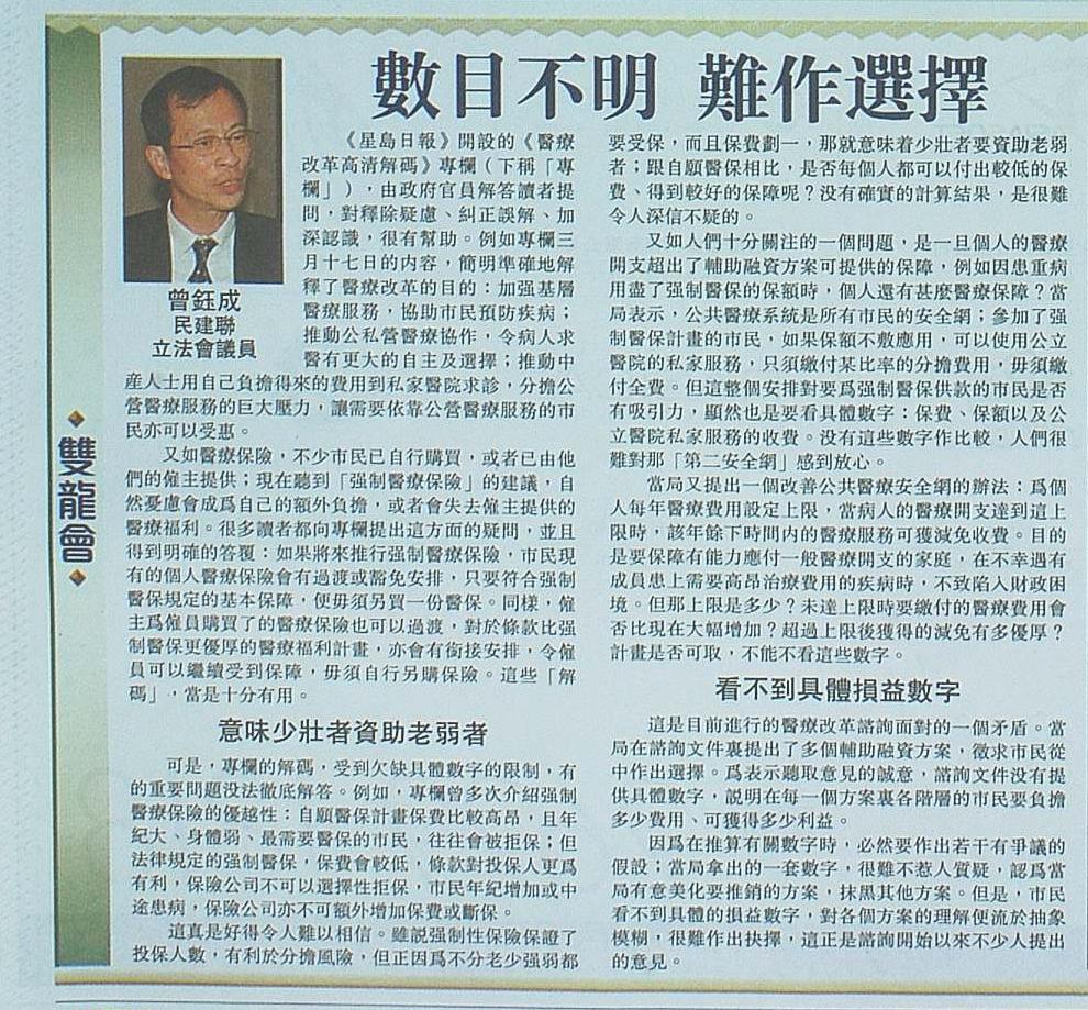 《星島日報》開設的《醫療改革高清解碼》專欄(下稱「專欄」),由政府官員解答讀者提問,對釋除疑慮、糾正誤解、加深認識,很有幫助。例如專欄三月十七日的內容,簡明準確地解釋了醫療改革的目的:加強基層醫療服務,協助市民預防疾病;推動公私營醫療協作,令病人求醫有更大的自主及選擇;推動中產人士用自己負擔得來的費用到私家醫院求診,分擔公營醫療服務的巨大壓力,讓需要依靠公營醫療服務的市民亦可以受惠。