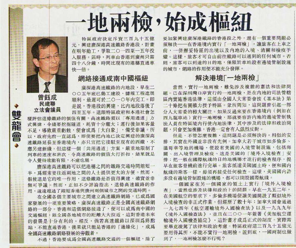 不過,香港要成為全國高速鐵路交通的一個樞紐,除了要加緊興建廣深港鐵路的香港段之外,還有一個重要問題必須解決──在香港境內實行「一地兩檢」,讓旅客在上車之前,一併辦妥特區的出境以及內地的入境、清關和檢疫手續。這樣,旅客才可自由前往鐵路可以通到的任何城市。否則,旅客可以到達的目的地,只限於車站設有邊境管制設施的城市,網絡的作用便不能充分發揮。
