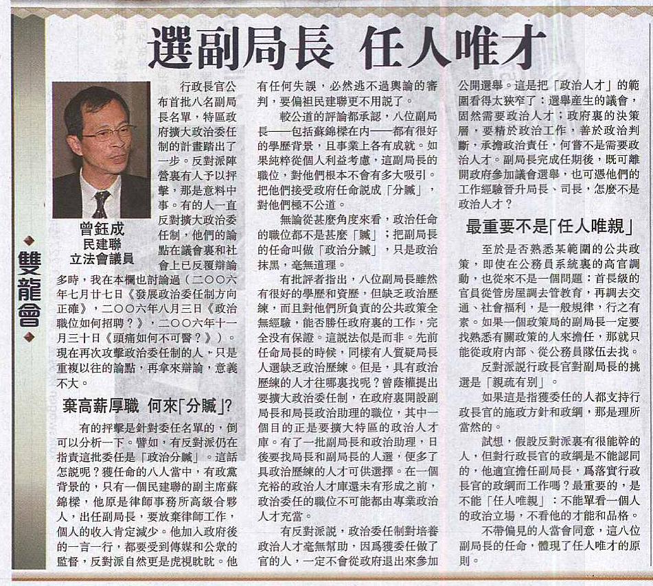 反對派說行政長官對副局長的挑選是「親疏有別」。如果這是指獲委任的人都支持行政長官的施政方針和政綱,那是理所當然的。試想,假設反對派裡有很能幹的人,但對行政長官的政綱是不能認同的,他適宜擔任副局長,為落實行政長官的政綱而工作嗎?最重要的,是不能「任人唯親」:不能單看一個人的政治立場,不看他的才能和品格。不帶偏見的人當會同意,這八位副局長的任命,體現了任人唯才的原則。(完)