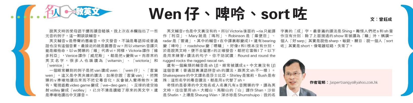 奇怪的是香港的中文地名或人名裡凡有s音開頭的字,譯為英文時,往往要用sh。大帽山、馬鞍山的“山”譯作Shan,沙田是Shatin,上環是Sheung Wan,深水埗是Shumshuipo;我的名字裡的“成”字,最普遍的譯法是Shing。難怪人們把s和sh當作沒有分別:除了上面提過的show常被讀為“騷”外,稱讚一個人“好sarp”其實是說他sharp,敏銳、醒目;說一個人“sort咗”其實是short,像電器短路,失常了。