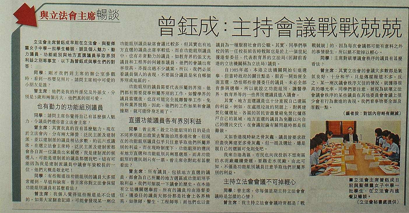 立法會主席曾鈺成早前在立法會,與聖傑靈女子中學一批學生暢談,談及個人魅力、勤力議員、功能組別與地方直選議員爭取界別利益之別等事宜,以下為曾鈺成與學生們的對答:同學:剛才我們到主席的辦公室參觀時,看到一些嬰兒照片,請問主席相中可愛的小朋友是誰?