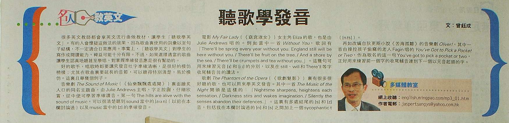 很多英文教師都會拿英文流行曲做教材,讓學生「聽歌學英文」。有的人會懷疑這做法的效果,因為歌曲裏使用的詞彙以至句子結構,不一定適合日常應用。事實上,「聽歌學英文」對學生的寫作或閱讀能力,裨益可能十分有限。不過,如果選擇適當的歌曲讓學生認真地聽甚至學唱,對掌握準確發音應是很有幫助的。