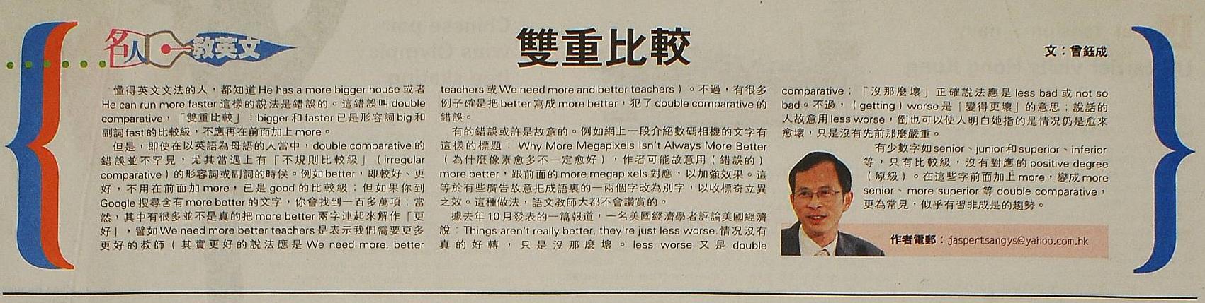 懂得英文文法的人,都知道He has a more bigger house 或者He can run more faster 這樣的說法是錯誤的。這錯誤叫double comparative, 「雙重比較」:bigger 和faster 已是形容詞big 和副詞fast 的比較級,不應再在前面加上more。
