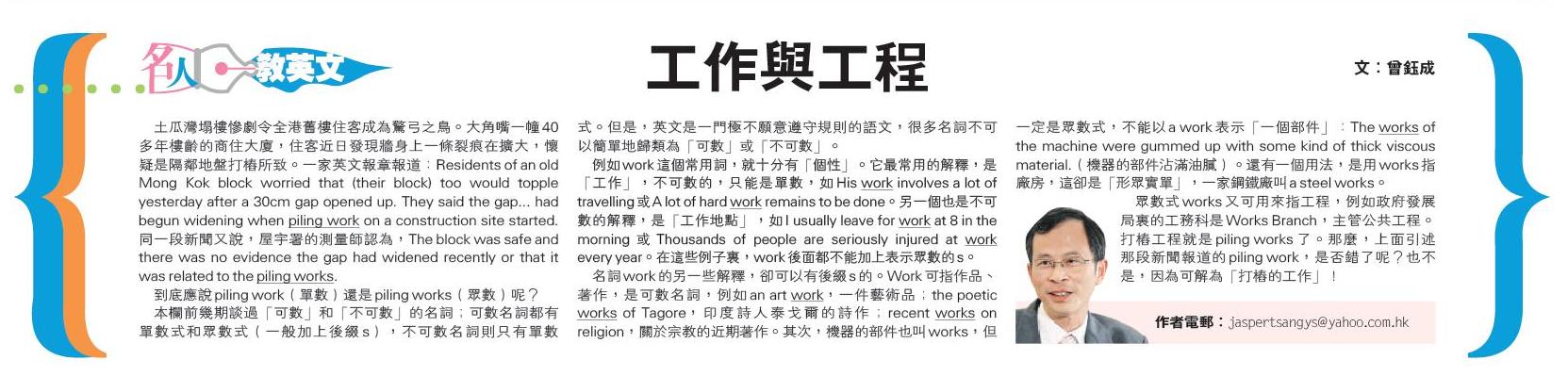 眾數式works 又可用來指工程,例如政府發展局裏的工務科是Works Branch,主管公共工程。打樁工程就是piling works 了。那麼,上面引述那段新聞報道的piling work,是否錯了呢?也不是,因為可解為「打樁的工作」!