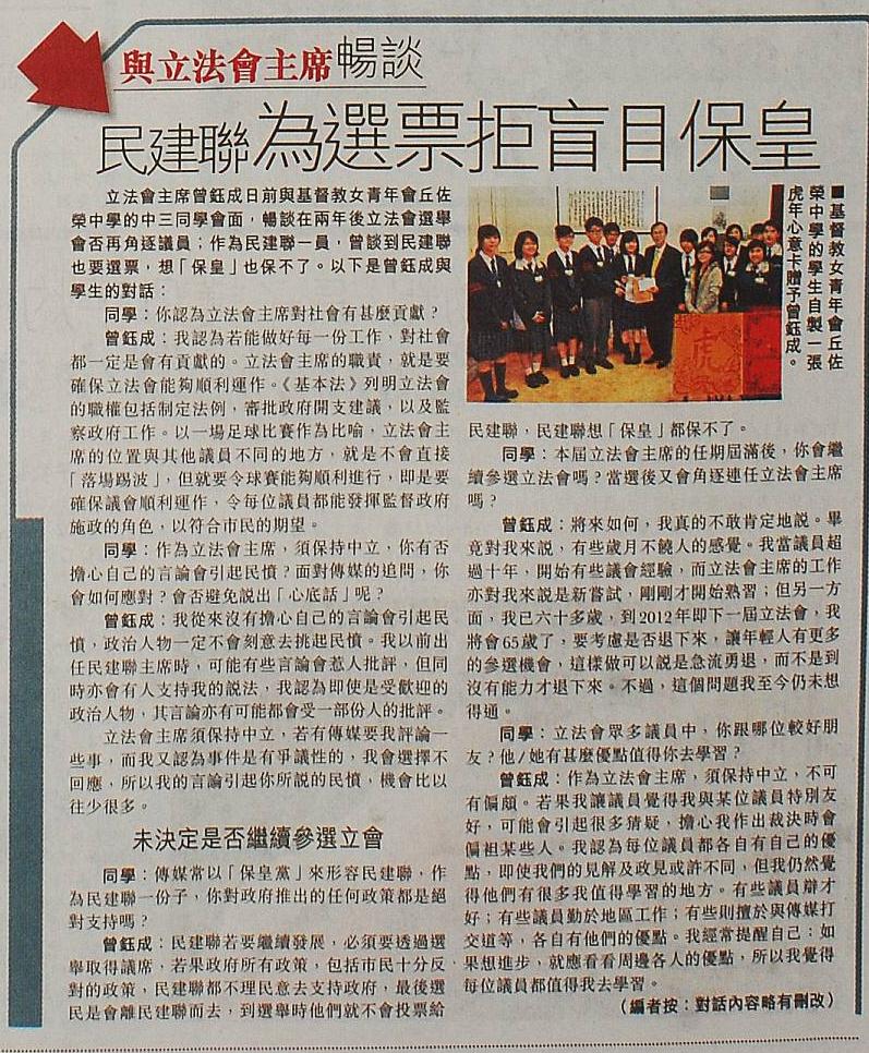 立法會主席曾鈺成日前與基督教女青年會丘佐榮中學的中三同學會面,暢談在兩年後立法會選舉會否再角逐議員;作為民建聯一員,曾談到民建聯也要選票,想「保皇」也保不了。以下是曾鈺成與學生的對話:同學:你認為立法會主席對社會有甚麼貢獻?