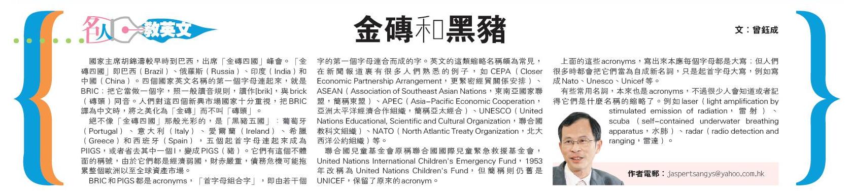BRIC 和PIGS 都是acronyms, 「首字母組合字」,即由若干個字的第一個字母連合而成的字。英文的這類縮略名稱頗為常見,在新聞報道裏有很多人們熟悉的例子, 如CEPA (Closer Economic Partnership Arrangement,更緊密經貿關係安排)、ASEAN(Association of Southeast Asian Nations,東南亞國家聯盟,簡稱東盟)、APEC(Asia-Pacific Economic Cooperation,亞洲太平洋經濟合作組織,簡稱亞太經合)、UNESCO(United Nations Educational, Scientific and Cultural Organization,聯合國教科文組織)、NATO(North Atlantic Treaty Organization,北大西洋公約組織)等。