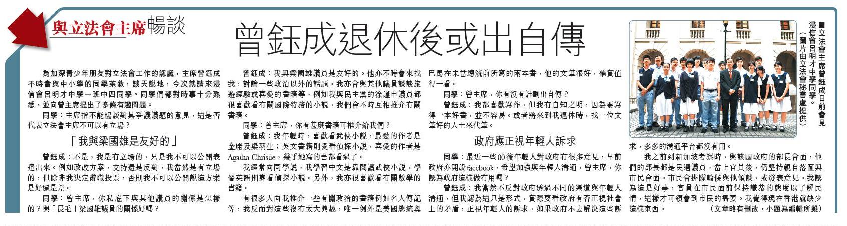 曾鈺成:我都喜歡寫作,但我有自知之明,因為要寫得一本好書,並不容易。或者將來到我退休時,找一位文筆好的人士來代筆。