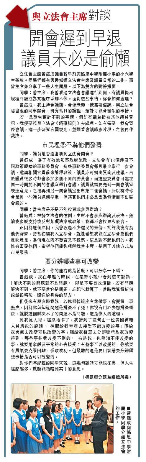 立法會主席曾鈺成議員較早前與協恩中學附屬小學的小六學生茶敘。同學們都有興趣知道立法會主席及議員日常的工作,而曾主席亦分享了一些人生閱歷。