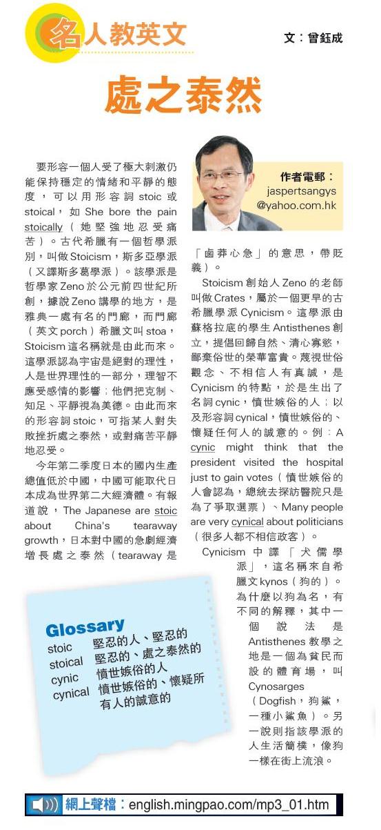 Stoicism 創始人Zeno 的老師叫做Crates,屬於一個更早的古希臘學派Cynicism。這學派由蘇格拉底的學生Antisthenes 創立,提倡回歸自然、清心寡慾,鄙棄俗世的榮華富貴。蔑視世俗觀念、不相信人有真誠, 是Cynicism 的特點,於是生出了名詞cynic,憤世嫉俗的人;以及形容詞cynical,憤世嫉俗的、懷疑任何人的誠意的。例: A cynic might think that the president visited the hospital just to gain votes(憤世嫉俗的人會認為,總統去探訪醫院只是為了爭取選票)、Many people are very cynical about politicians(很多人都不相信政客)。