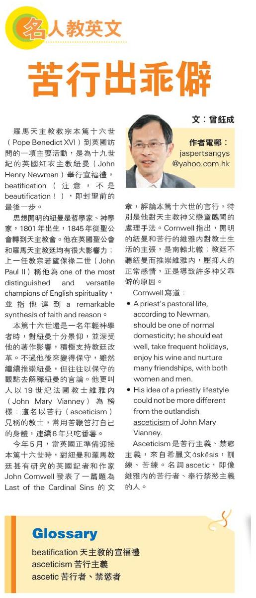 羅馬天主教教宗本篤十六世(Pope Benedict XVI)到英國訪問的一項主要活動,是為十九世紀的英國紅衣主教紐曼(John Henry Newman)舉行宣福禮,beatification ( 注意, 不是beautification!),即封聖前的最後一步。