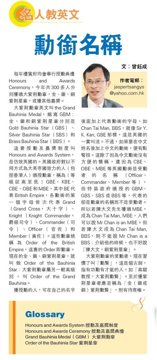 所以若陳大文先生獲頒MBE,成為Chan Tai Man, MBE,人們可以說Mr Chan is an MBE。但若陳大文成為Chan Tai Man,BBS, 則不能說Mr Chan is aBBS;介紹他的時候,也不好說「陳大文,銅紫荊星章」。