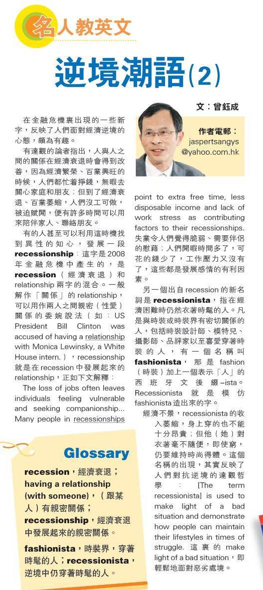 有的人甚至可以利用這時機找到異性的知心, 發展一段recessionship:這字是2008年金融危機中產生的, 是recession ( 經濟衰退) 和relationship 兩字的混合。一般解作「關係」的relationship,可以用作兩人之間親密(性愛)關係的委婉說法( 如: US President Bill Clinton was accused of having a relationship with Monica Lewinsky, a White House intern.),recessionship就是在recession 中發展起來的relationship,正如下文解釋:The loss of jobs often leaves individuals feeling vulnerable and seeking companionship…Many people in recessionships point to extra free time, less disposable income and lack of work stress as contributing factors to their recessionships.失業令人們覺得脆弱、需要伴侶的慰藉;人們閒暇時間多了,可花的錢少了,工作壓力又沒有了,這些都是發展感情的有利因素。