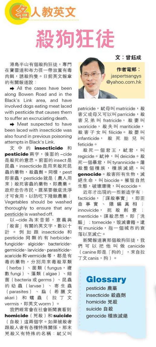 文中的insecticide 和pesticide 兩字,後面的-cide是殺死的意思。前面的insect 是昆蟲,insecticide 是用來殺死昆蟲的藥物,殺蟲劑。同樣,pest即害蟲,pesticide 就是(農人用來)殺死害蟲的藥物,即農藥。政府忠告市民,蔬菜要徹底洗淨才可食用,以防吃下殘餘農藥:Vegetables should be washed thoroughly to ensure that any pesticide is washed off.