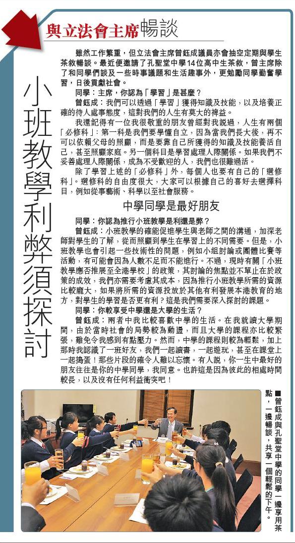 雖然工作繁重,但立法會主席曾鈺成議員亦會抽空定期與學生茶敘暢談。最近便邀請了孔聖堂中學14位高中生茶敘,曾主席除了和同學們談及一些時事議題和生活趣事外,更勉勵同學勤奮學習,日後貢獻社會。