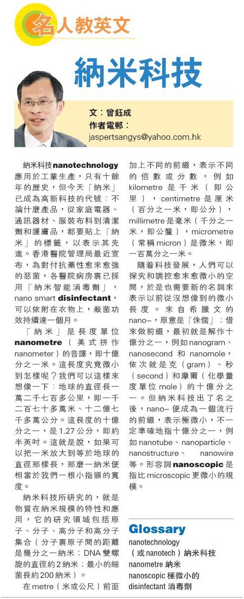 納米科技nanotechnology應用於工業生產,只有十餘年的歷史,但今天「納米」已成為高新科技的代號:不論什麼產品,從家庭電器、通訊器材、服裝布料到清潔劑和護膚品,都要貼上「納米」的標籤, 以表示其先進。香港醫院管理局最近宣布,為對付抗藥性愈來愈強的惡菌,各醫院病房裏已採用「納米智能消毒劑」,nano smart disinfectant,可以依附在衣物上,殺菌功效持續達一個月。