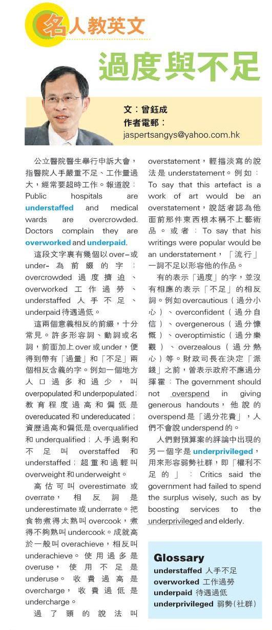 這兩個意義相反的前綴,十分常見。許多形容詞、動詞或名詞,前面加上over 或under,便得到帶有「過量」和「不足」兩個相反含義的字。例如一個地方人口過多和過少, 叫overpopulated 和underpopulated;教育程度過高和偏低是overeducated 和undereducated;資歷過高和偏低是overqualified和underqualified;人手過剩和不足叫overstaffed 和understaffed; 超重和過輕叫overweight 和underweight。