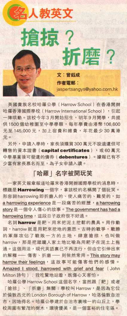 一家英文報章報道哈羅來香港開辦國際學校的消息時,標題是Harrowing 一個字,拿該校的名稱開了個玩笑。形容詞harrowing 即折磨人的、使人痛苦的、難受的,如a harrowing experience 是一段痛苦的經歷,a harrowingstory 是一個令人傷心的故事。The government has had aharrowing time,這段日子政府很不好過。