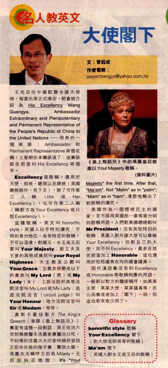 王光亞任中國駐聯合國大使時,每當出席正式場合,都會被介紹為His Excellency Wang Guangya, Ambassad or Extraordinary and Plenipotentiary and Permanent Representative of the People’s Republic of China to the United Nations ─很長的一個銜頭! Ambassador 和Permanent Representative 兩個名稱,上星期在本欄談過了;這裏談談在前面的His Excellency 兩個字。