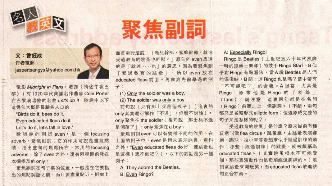 聚焦副詞在句子裏的位置,一般是在它要指出的焦點詞語之前,而且要盡量貼近。例如上面首兩行是說: 「鳥兒幹那,蜜蜂幹那,就連受過教育的跳蚤也幹那。」原句的even 表達的是「就連……也」的意思,因為要聚焦到「受過教育的跳蚤」, 所以even 放在educated fleas 前面。再如我先前舉過的例子: