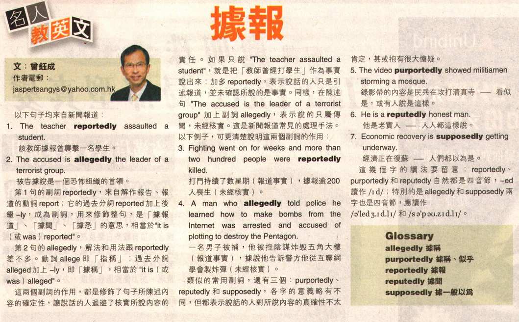這兩個副詞的作用,都是修飾了句子所陳述內容的確定性,讓說話的人迴避了核實所說內容的責任。如果只說“The teacher assaulted a student”,就是把“教師曾經打學生”作為事實說出來;加多reportedly,表示說話的人只是引述報導,並未確認所說的是事實。同樣,在陳述句“The accused is the leader of a terrorist group”加上副詞allegedly,表示說的只屬傳聞,未經核實。這是新聞報導常見的處理手法。以下例子,可更清楚說明這兩個副詞的作用: