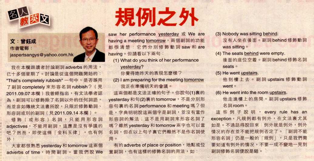 我在本欄跟讀者討論副詞adverbs 的用法,已十多個星期了。討論是從這個問題開始的:"That’s completely rubbish" 一句中,是否誤用了副詞completely 來形容名詞rubbish?(見2011.09.07 本欄)我曾經指出,有文法學者認為,副詞可以修飾除了名詞以外的任何詞語,而並非如傳統文法書所說,只限於修飾動詞、形容詞或別的副詞(見2011.09.14 本欄)。修飾( 或形容) 名詞, 只能用形容詞adjectives,不能用副詞,這應是沒有爭議的吧?然而,即使這條「金科玉律」,也有例外!