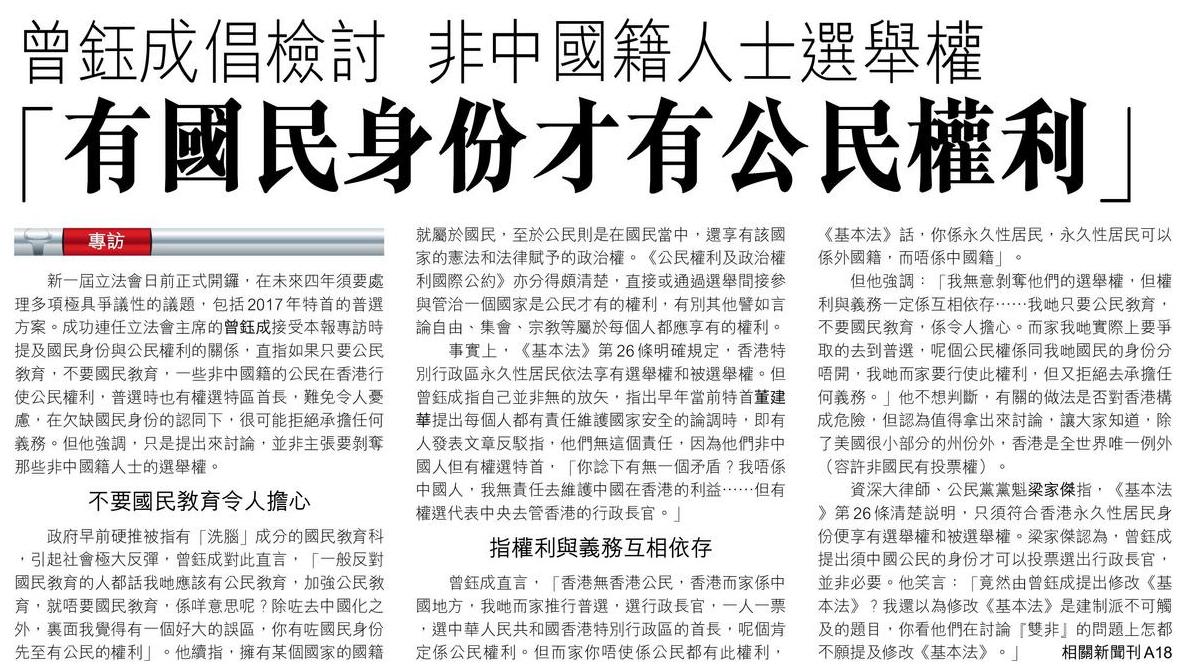 事實上,《基本法》第26 條明確規定,香港特別行政區永久性居民依法享有選舉權和被選舉權。但曾鈺成指自己並非無的放矢,指出早年當前特首董建華提出每個人都有責任維護國家安全的論調時,即有人發表文章反駁指,他們無這個責任,因為他們非中國人但有權選特首, 「你諗下有無一個矛盾?我唔係中國人,我無責任去維護中國在香港的利益……但有權選代表中央去管香港的行政長官。」