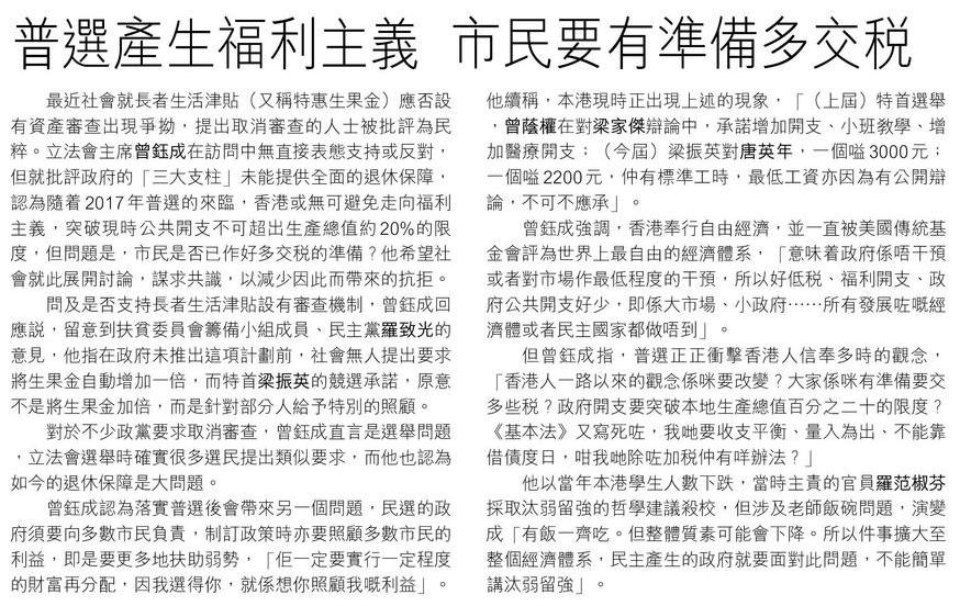 最近社會就長者生活津貼(又稱特惠生果金)應否設有資產審查出現爭拗,提出取消審查的人士被批評為民粹。立法會主席曾鈺成在訪問中無直接表態支持或反對,但就批評政府的「三大支柱」未能提供全面的退休保障,認為隨着2017 年普選的來臨,香港或無可避免走向福利主義,突破現時公共開支不可超出生產總值約20%的限度,但問題是,市民是否已作好多交稅的準備?他希望社會就此展開討論,謀求共識,以減少因此而帶來的抗拒。