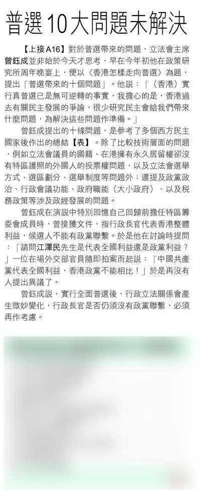 對於普選帶來的問題,立法會主席曾鈺成並非始於今天才思考,早在今年初他在政策研究所周年晚宴上,便以〈香港怎樣走向普選〉為題,提出「普選帶來的十個問題」。他說: 「(香港)實行真普選已是無可逆轉的事實,我擔心的是,香港過去有關民主發展的爭論,很少研究民主會給我們帶來什麼問題,為解決這些問題作準備。」曾鈺成提出的十條問題,是參考了多個西方民主國家後作出的總結【表】。除了比較技術層面的問題,例如立法會議員的國籍、在港擁有永久居留權卻沒有特區護照的外國人的投票權問題,以及立法會選舉方式、選區劃分、選舉制度等問題外;還提及政黨政治、行政會議功能、政府職能(大小政府)、以及稅務政策等涉及政經發展的問題。