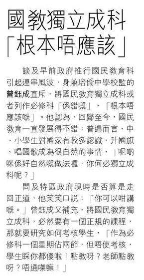 談及早前政府推行國民教育科引起連串風波,身兼培僑中學校監的曾鈺成直斥,將國民教育獨立成科或者列作必修科「係錯嘅」、「根本唔應該嘅」。他認為,回歸至今,國民教育一直發展得不錯;普遍而言,中、小學生對國家有較多認識,升國旗、唱國歌成為很自然的事情, 「呢啲咪係好自然嘅做法囉,你何必獨立成科呢?」